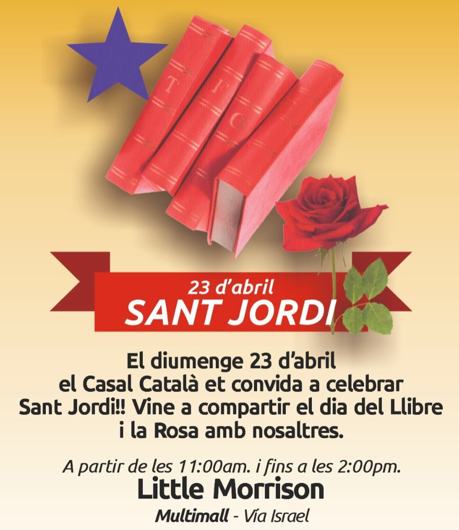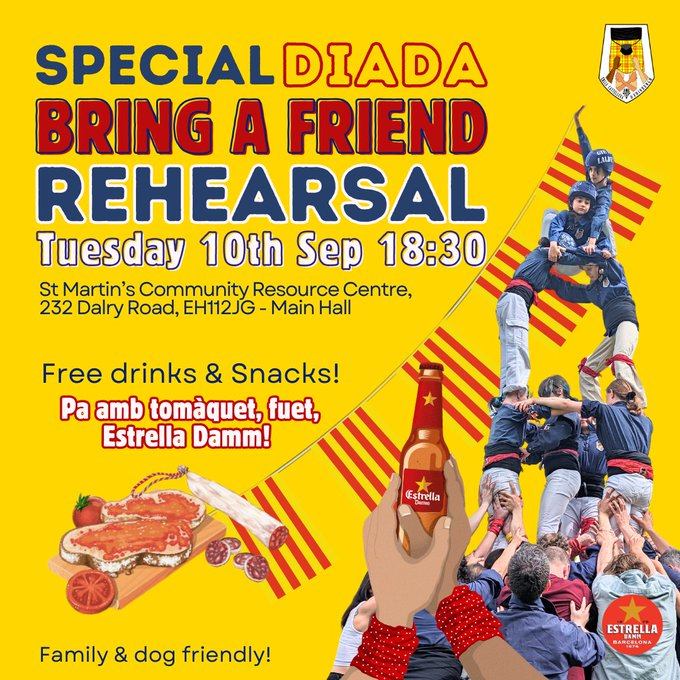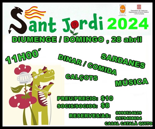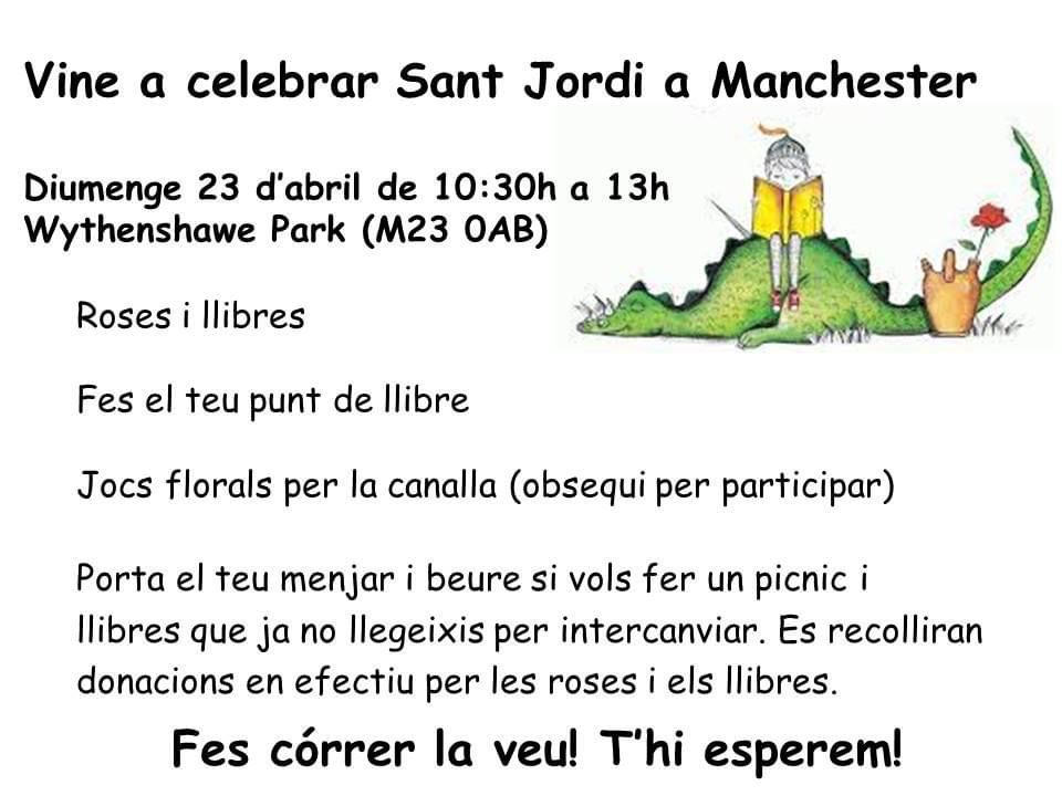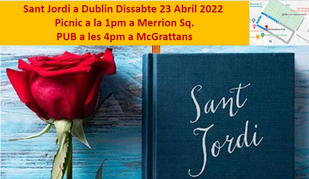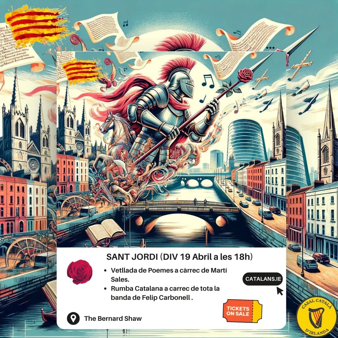 (Bon dia a tothom! 🐉🌹\r\nUs convidem a celebrar Sant Jordi a Dublin el proper diumenge 26 d’abril! Serà una jornada d’aquelles ben maques i oberta a tothom. 🇮🇪✨\r\nAquí teniu el pla:\r\n• 11:00h - 13:00h: Començarem amb un assaig obert de Castellers.\r\n• 📚 A continuació: Intercanvi de llibres, música i ambient català.\r\n• 🎟️ La Rifa: Tenim un munt de regals preparats... inclòs un Kindle! 📖📱\r\n📍 On? Portobello Community Hall.\r\n🕒 Quan? De 11h a 15h.\r\n💰 Preu? L'esdeveniment és totalment gratuït.\r\nÉs una activitat curta, bonica i una oportunitat fantàstica per trobar-nos. No hi falteu! 🐲🌹\r\nEns veiem allà? 🙌)