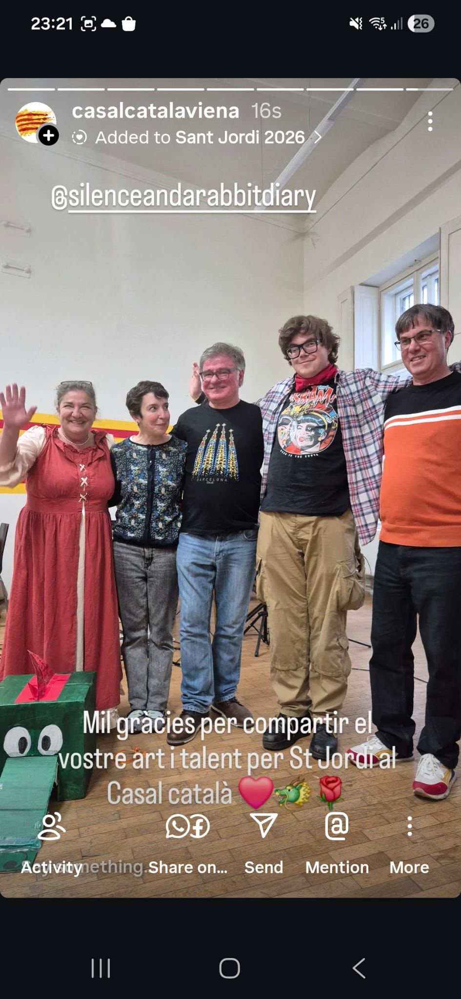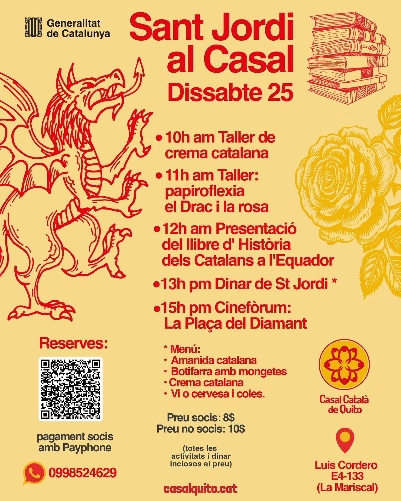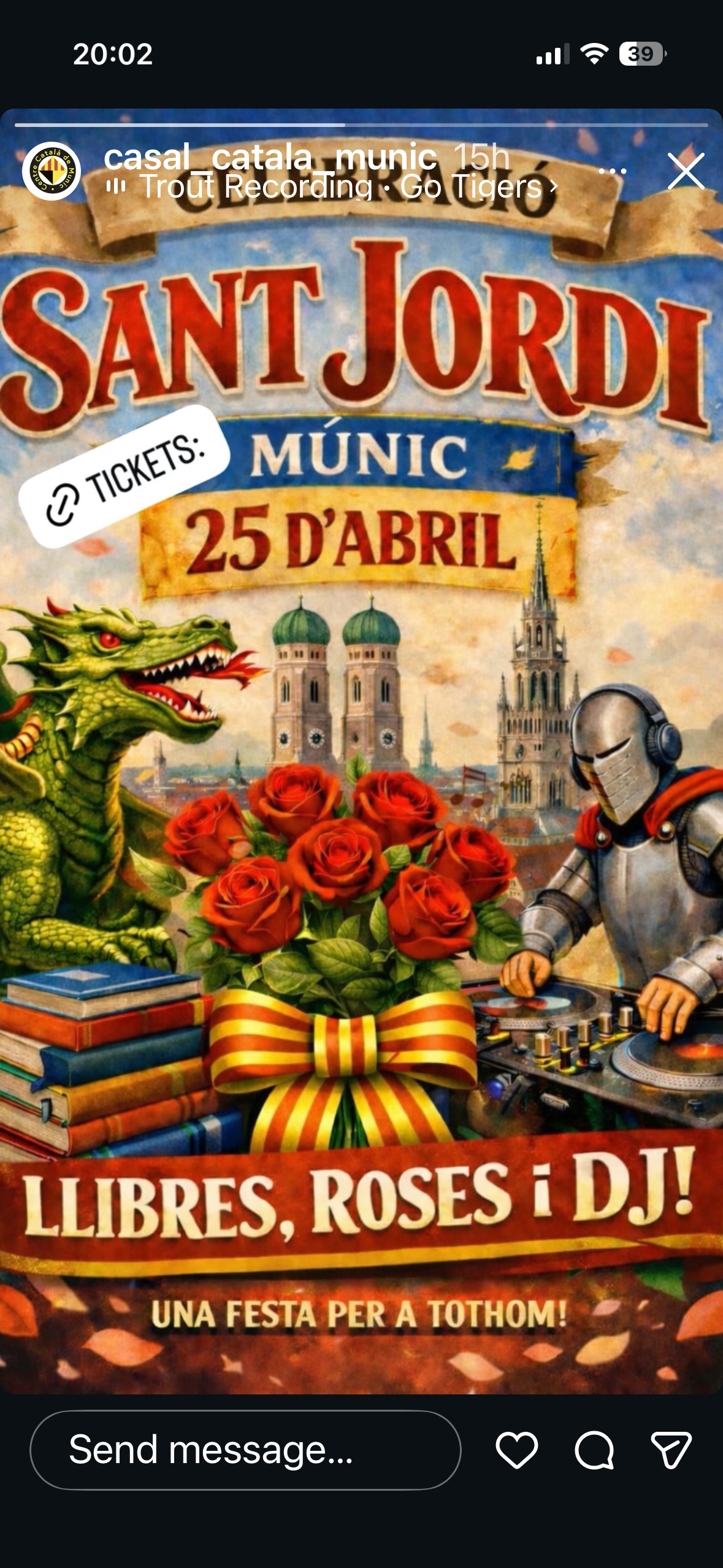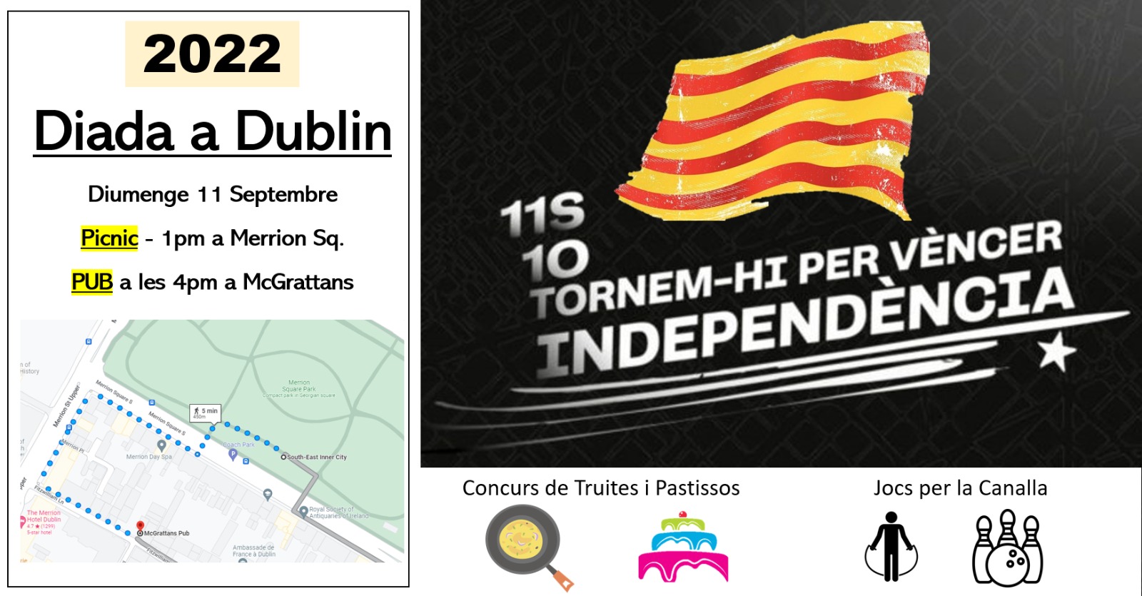 (Bon dia a tothom! 🐉🌹\r\nUs convidem a celebrar Sant Jordi a Dublin el proper diumenge 26 d’abril! Serà una jornada d’aquelles ben maques i oberta a tothom. 🇮🇪✨\r\nAquí teniu el pla:\r\n• 11:00h - 13:00h: Començarem amb un assaig obert de Castellers.\r\n• 📚 A continuació: Intercanvi de llibres, música i ambient català.\r\n• 🎟️ La Rifa: Tenim un munt de regals preparats... inclòs un Kindle! 📖📱\r\n📍 On? Portobello Community Hall.\r\n🕒 Quan? De 11h a 15h.\r\n💰 Preu? L'esdeveniment és totalment gratuït.\r\nÉs una activitat curta, bonica i una oportunitat fantàstica per trobar-nos. No hi falteu! 🐲🌹\r\nEns veiem allà? 🙌)