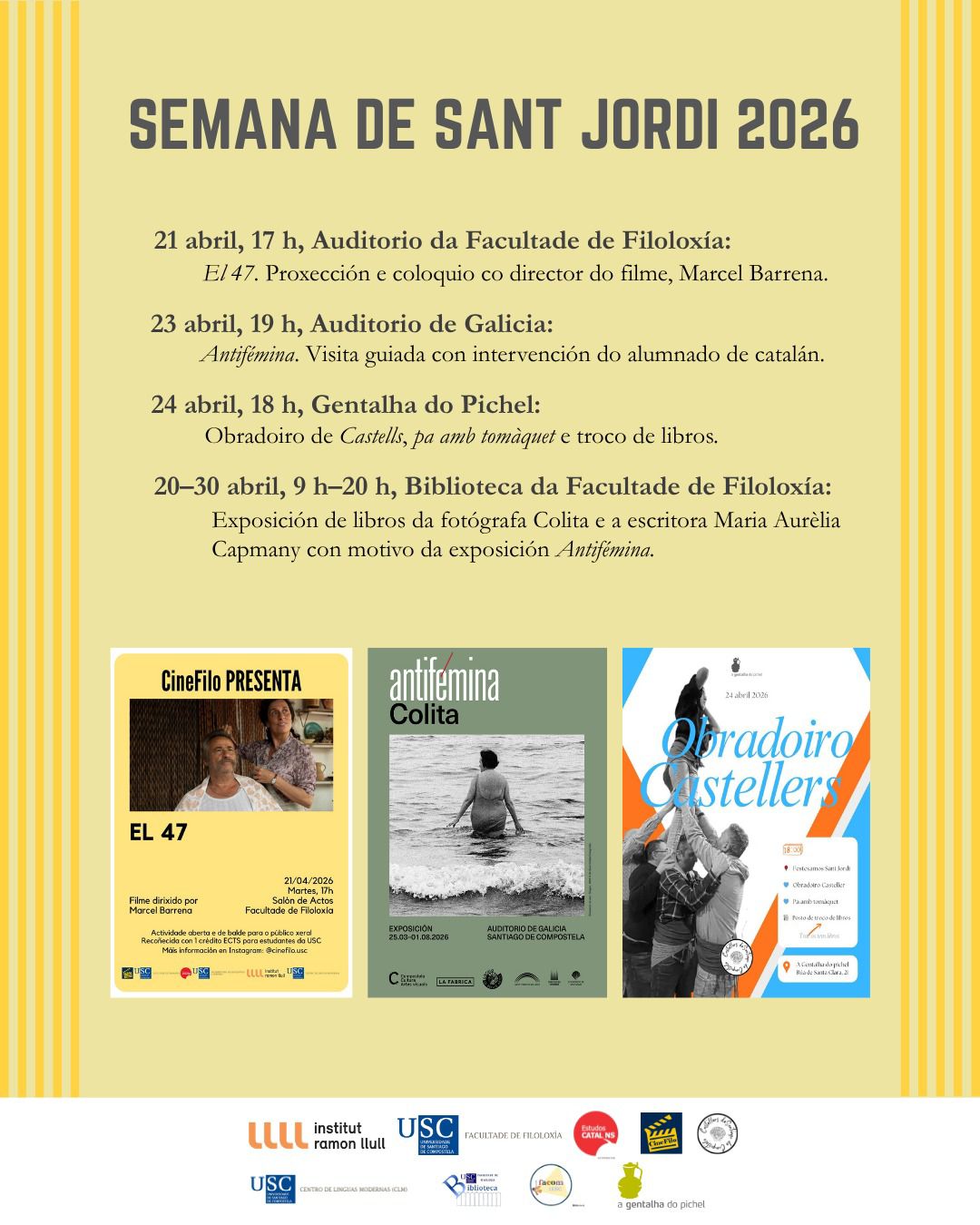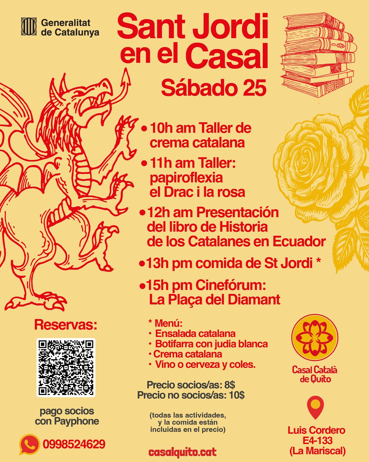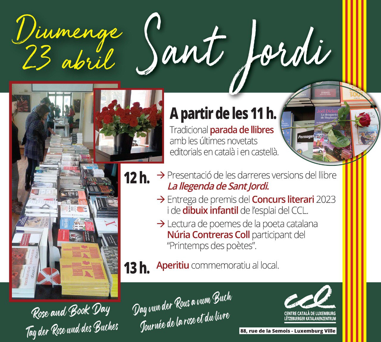 (Agafa la teva agenda i reserva la data per a una tarda plena de roses, llibres i més!\r\n\r\nQuan? Dissabte 25 d’abril de 2026\r\n\r\nMainada de 15:30 h – 17:30 h\r\n\r\nGrans de 18:00 h - 23:00 h\r\n\r\nOn? IG-Feuerwache (aprop de la Theresienwiese/U4-U5 parada Schwanthalerhöhe)\r\n\r\nPrograma d’activitats: Parada de llibres i parada de roses tota la tarda.\r\n\r\nTambé hi haurà una parada d'intercanvi de llibres.\r\n\r\nEscriu a info@casalmunic.de si vols encarregar un llibre. Farem una comanda conjunta i el diss. 25 d’abril el podràs recollir amb un descompte de 10% per socis\r\n\r\n15:30 h – Actuació i taller de màgia per a petits\r\n\r\n17:00 h – Berenar i begudes per a totes les edats a partir de les 17:00 h\r\n\r\n18:00 h – Joc de Sant Jordi 20:00 h – Música i ball amb el DJ Shak (profi) que animarà la festa amb música catalana i internacional.\r\n\r\nT’hi esperem!\r\n\r\nEl teu Centre Català de Munic e.V. - El Casal)