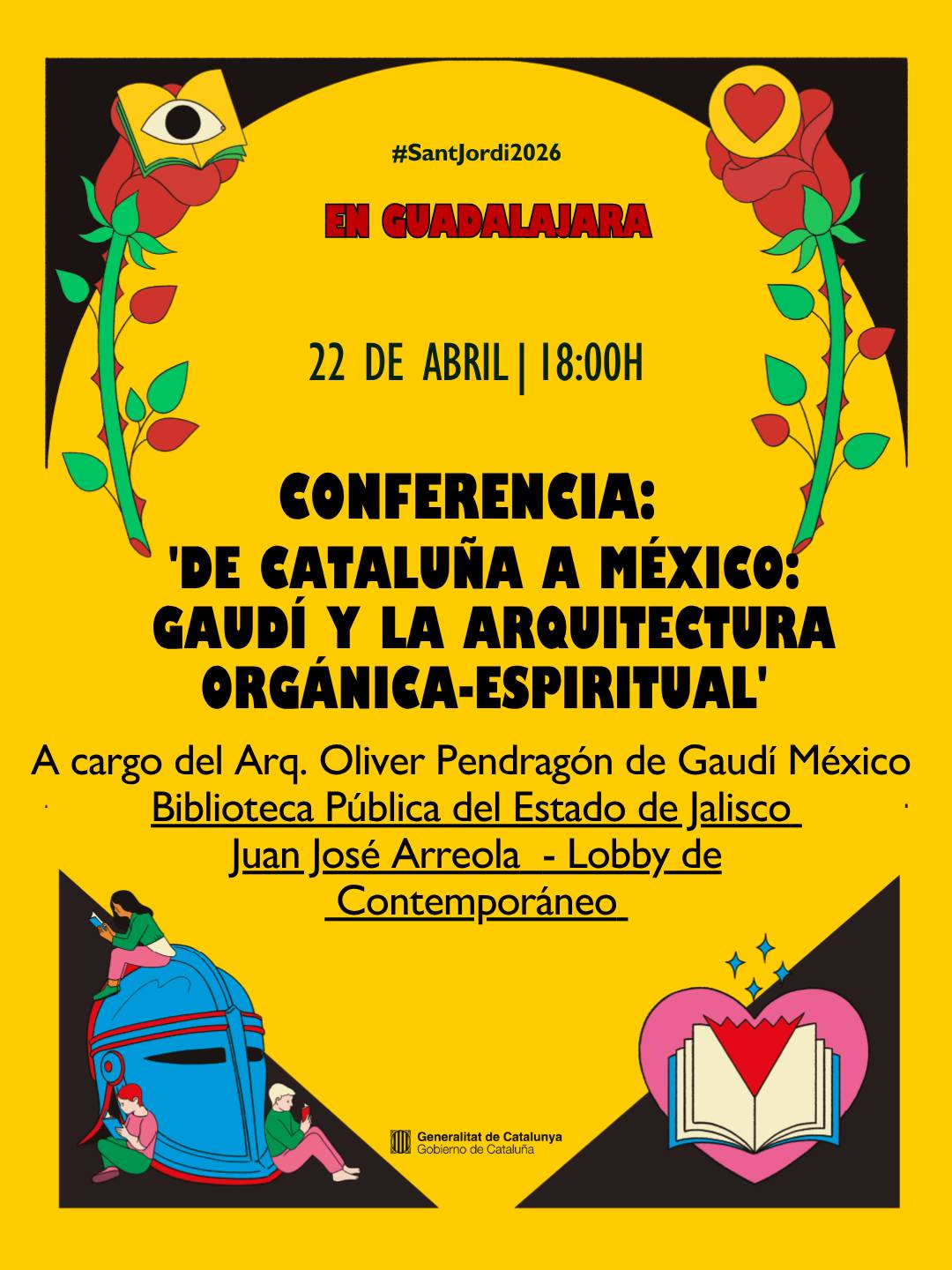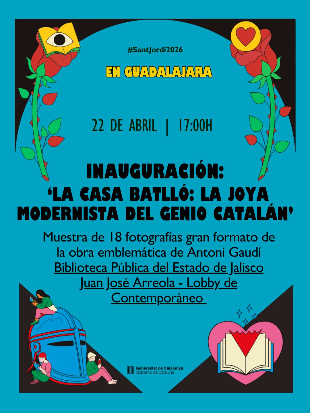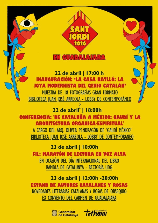 (Sant Jordi en Guadalajara: Homenaje a Antoní Gaudí\r\n \r\nEste año Sant Jordi también se festeja en Guadalajara, sede la Feria Internacional del Libro y ciudad hermanada culturalmente con Barcelona. \r\n \r\nEn el marco del 'Año conmemorativo Antoni Gaudí', con motivo de su centenario luctuoso, rendimos homenaje a unos de los arquitectos más geniales y universales.\r\n \r\nEl próximo miércoles 22 de abril, a las 17:00h, te invitamos a la inauguración de la exposición fotográfica ‘La Casa Batlló: la joya modernista del genio catalán', una muestra de dieciocho imágenes de gran formato sobre esta obra cumbre que podrás ver en el lobby de la Biblioteca Pública del Estado de Jalisco Juan José Arreola. \r\n \r\nPosteriormente, el mismo día a las 18:00h, y en el mismo espacio, te invitamos a la conferencia ‘De Cataluña a México: Gaudí y la arquitectura orgánica-espiritual’, a cargo del arquitecto mexicano y miembro de la Asociación Gaudí México, Oliver Pendragón. Un recorrido sobre el legado de Gaudí en México.)