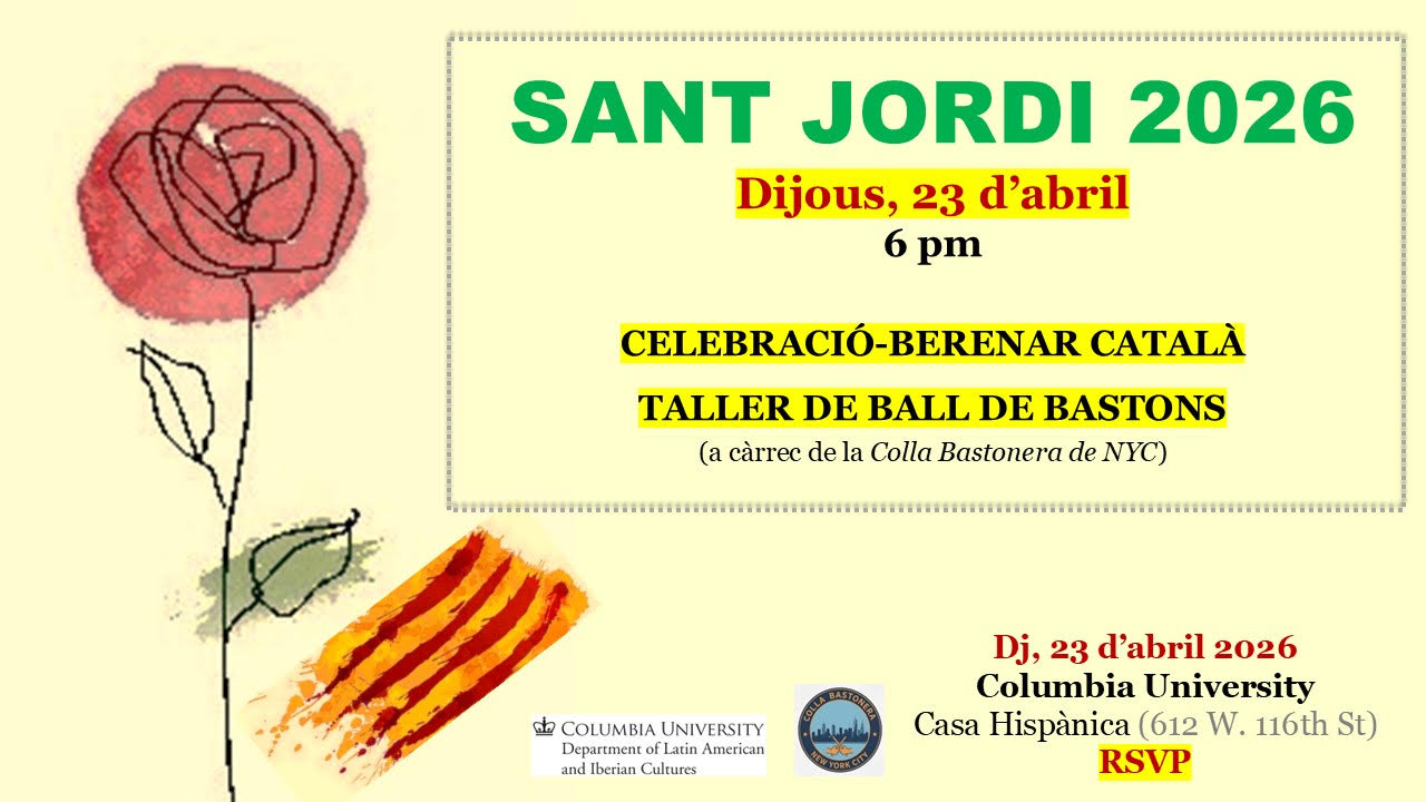 (DIJOUS 23 d'ABRIL, a partir de les 6 de la tarda \r\n\r\nCasa , Columbia University\r\n\r\nGratuït i obert al públic\r\n\r\nSI US PLAU, confirmeu la vostra assistència (RSVP en aquest enllaç))
